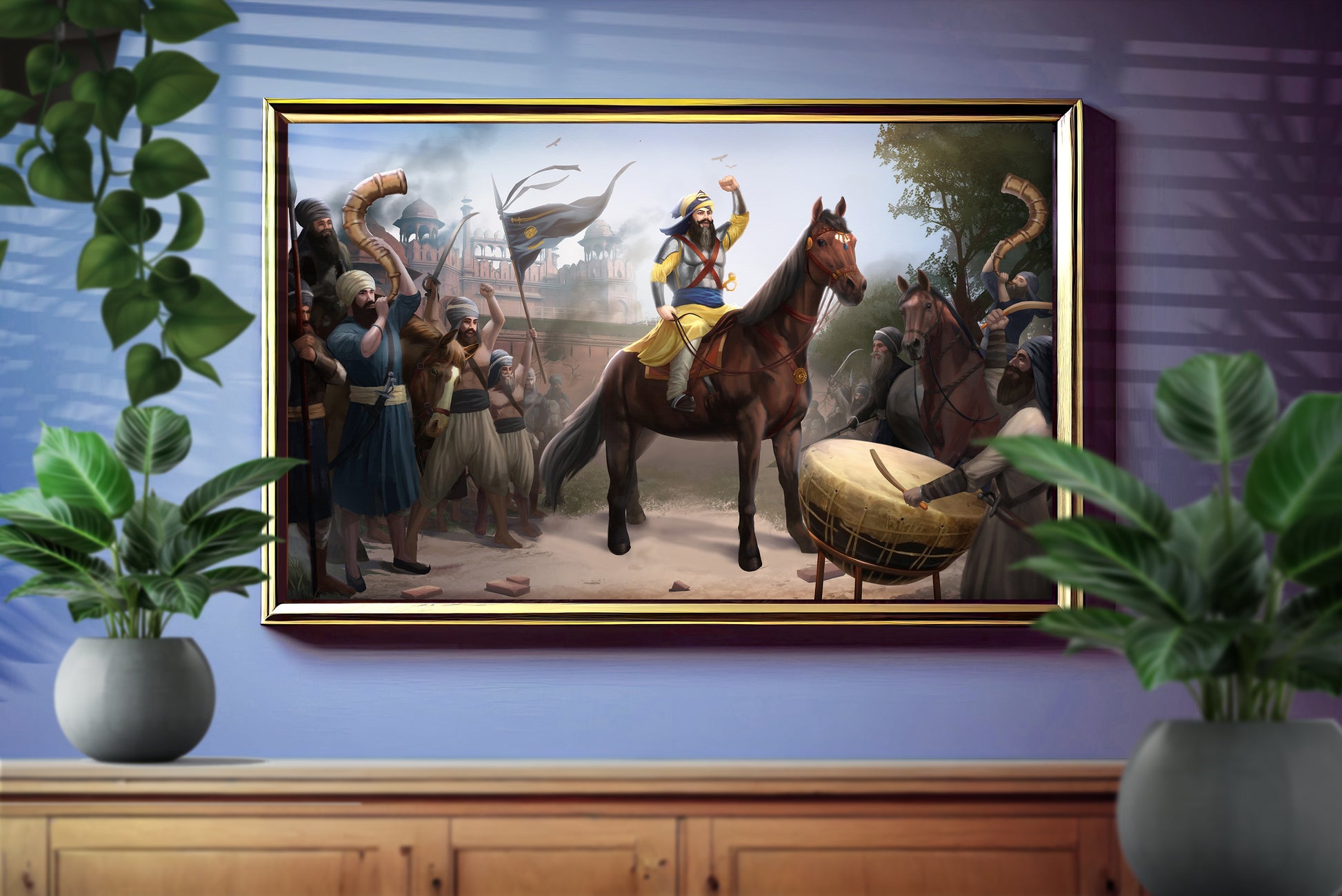 The historic Delhi Fateh has been brought alive by this lovely painting from Anaahad. Baba Baghel Singh and Singhs capture the Delhi Throne to establish the might of Khalsa.